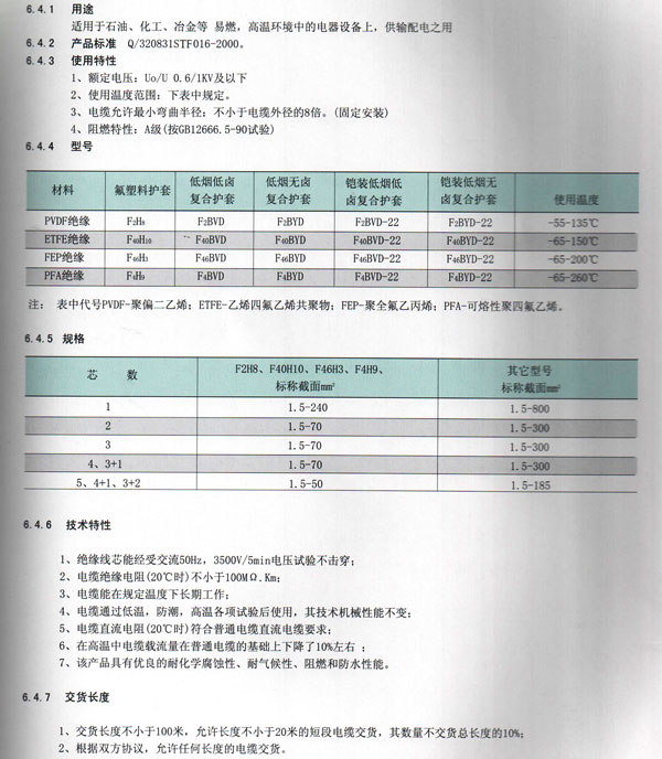 氟塑料绝缘及护套耐高温电力电缆